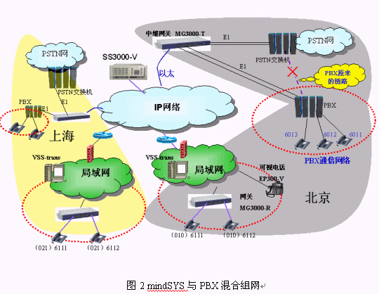 我們建設(shè)mindSYS系統(tǒng)的時(shí)候基本上不改變?cè)瓉?lái)PBX的布線和配置,PBX原來(lái)的數(shù)字中繼直接連接到運(yùn)營(yíng)商的程控交換機(jī),我們現(xiàn)在只是將PBX的數(shù)字中繼連接到中繼網(wǎng)關(guān)MG3000-T。PBX通信系統(tǒng)的電話完全沒(méi)有改變,還使用原來(lái)的電話號(hào)碼,打分機(jī)直接撥小號(hào),打外線先撥0。mindSYS系統(tǒng)下的電話使用方式也完全一樣,對(duì)用戶來(lái)說(shuō)就是一套系統(tǒng)。如北京的6011可以直接撥打6111,6111用戶也可以直接撥打6011,6111打外線先撥0,如062043020。北京的用戶呼叫異地用戶需要撥打完整號(hào)碼(大號(hào)),如北京的6011用戶撥0216111就可以接通上海的用戶,反之亦然。mindSYS系統(tǒng)的電話(圖2的所有電話)之間通話都免費(fèi)。這樣我們的行業(yè)用戶可以既不改變?cè)瓉?lái)的使用習(xí)慣,又能夠靈活的規(guī)劃各地的電話號(hào)碼來(lái)完成一個(gè)大型的跨地域的電話系統(tǒng)。
