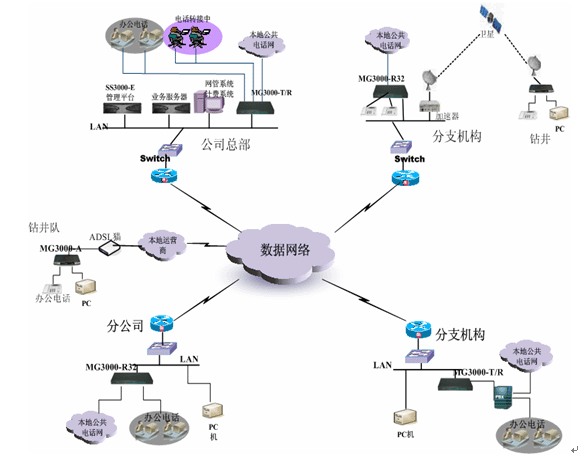 本系統(tǒng)主要應(yīng)用于石油化工行業(yè),基于目前的數(shù)據(jù)網(wǎng)絡(luò)來承載實(shí)現(xiàn)公司總部、分支機(jī)構(gòu)、煉油廠、辦事處、加油站、鉆井平臺(tái)等語音電話的統(tǒng)一管理、維護(hù),且通過網(wǎng)絡(luò)傳輸各端點(diǎn)之間通話、傳真不產(chǎn)生任何的費(fèi)用。所有的業(yè)務(wù)、號(hào)碼規(guī)劃、開通可由企業(yè)自主來管理維護(hù),和目前企業(yè)的內(nèi)部電話充分融合,對(duì)企業(yè)原有的撥號(hào)方式、電話號(hào)碼、網(wǎng)絡(luò)結(jié)構(gòu)不做任何的改變和影響。