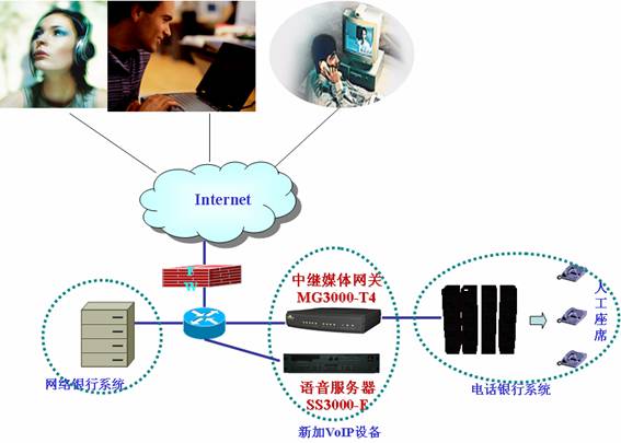 如圖,新加SIP融合通信平臺SS3000-E,完成客戶端軟電話的注冊、呼叫控制等功能;部署中繼媒體網(wǎng)關(guān)連接數(shù)據(jù)網(wǎng)絡(luò)和電話銀行系統(tǒng)的程控交換機。