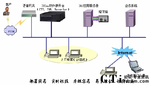 有沒有辦法讓數(shù)量占多數(shù)的中小集團(tuán)客戶也能享受IP呼叫中心的好處呢?在一個(gè)日益成熟的開放市場(chǎng)中,答案是肯定的。目前已經(jīng)有國(guó)內(nèi)廠商針對(duì)這塊市場(chǎng)在進(jìn)行耕耘,我們可以看看國(guó)內(nèi)在這方面走在前列的廠商大唐高鴻新推出的針對(duì)中小企業(yè)的IP呼叫中心產(chǎn)品SS3000-C。SS3000-C,采用純IP技術(shù),利用先進(jìn)的軟交換技術(shù),系統(tǒng)可伸縮性極強(qiáng),可隨客戶需要進(jìn)行靈活建設(shè)。