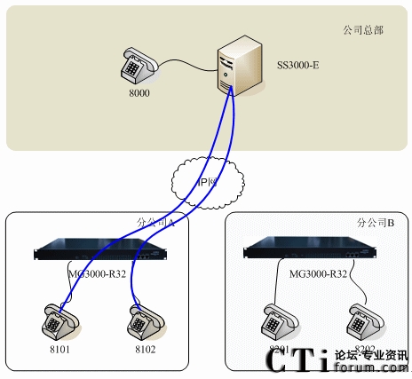 圖一:方案1:SS3000-E與IPPBX MG3000-R32聯合組網示意圖