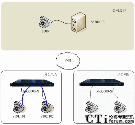 圖二:方案2:SS3000-E與IPPBX MG3000-X聯合組網示意圖