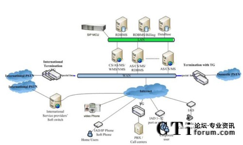 計(jì)費(fèi)系統(tǒng)將把視頻通話和普通的語音通話分開來計(jì)費(fèi),視頻會(huì)議業(yè)務(wù)也可以作為一項(xiàng)特殊業(yè)務(wù)單獨(dú)計(jì)費(fèi)。所有這些業(yè)務(wù)都使用相同的計(jì)費(fèi)和OAM系統(tǒng)。在這個(gè)運(yùn)營商級軟交換系統(tǒng)中,已經(jīng)把視頻業(yè)務(wù)完全集成進(jìn)了系統(tǒng)。下面是網(wǎng)絡(luò)示意圖: