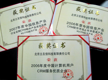 2007年1月16日,中國計算機用戶協會在京召開隆重而盛大的年度頒獎儀式。MyCRM在本次會上榮獲殊榮,一舉囊括了“2006年度中國信息產業(yè)CRM 軟件市場占有率最高產品”,“ 2006年度中國計算機用戶CRM服務優(yōu)質企業(yè)”和“2007 年度中國信息產業(yè)行業(yè)采購CRM軟件產品首選品牌”。本次獲獎充分體現了MyCRM在CRM市場的全面領先優(yōu)勢。
