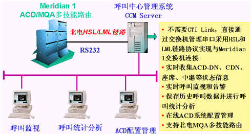 華呼CCM系統(tǒng)不需要Meridian Link,直接通過(guò)交換機(jī)管理串口采用HSL(High-Speed Link)和LML(Load Management Link)鏈路協(xié)議實(shí)現(xiàn)與Meridian 1交換機(jī)連接;實(shí)時(shí)收集ACD座席、隊(duì)列、中繼等狀態(tài)信息,提供實(shí)時(shí)監(jiān)控和告警;保存各類歷史呼叫數(shù)據(jù),提供多種統(tǒng)計(jì)分析手段;提供ACD有關(guān)參數(shù)的實(shí)時(shí)和預(yù)定配置管理功能;支持北電MQA(Multiple Queue Assignment)技能路由功能,使座席可同時(shí)登錄到5個(gè)ACD隊(duì)列,在交換機(jī)內(nèi)部實(shí)現(xiàn)技能路由;對(duì)各類數(shù)據(jù)分析以表格、直方圖、餅圖等方式進(jìn)行直觀顯示并可進(jìn)行打印,以及提供多樣的告警提示。