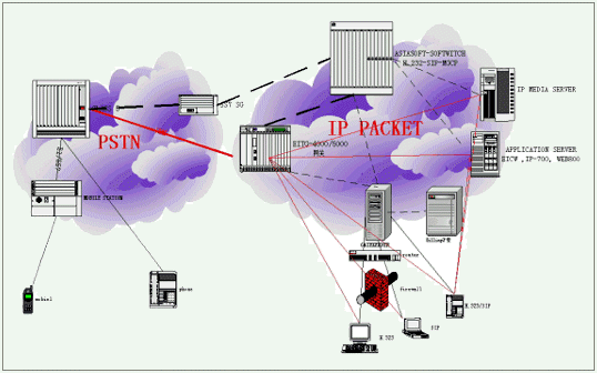 1、可以把裝有eProxy的服務(wù)器看成專用交換機(jī)VoIP switch,它負(fù)責(zé)內(nèi)外電話的接通與斷開。如圖: