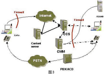----圖2說明了在集成互聯(lián)網(wǎng)電話網(wǎng)關(guān)時(shí)進(jìn)行協(xié)同會(huì)話的流程,圖中實(shí)線為數(shù)據(jù)信息傳遞的鏈路,虛線為語音傳遞的鏈路。通過ITG和PBX/ACD 的特定交互接口,將呼叫中心外部的IP電話鏈路集成到CCIS系統(tǒng)中。值得注意的是,ITG 和CCS需要安裝在企業(yè)防火墻的外側(cè),以方便呼叫者的訪問。