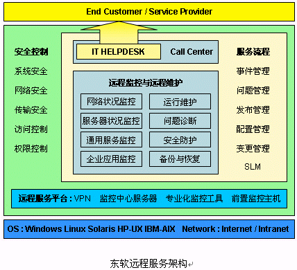通過東軟遠(yuǎn)程服務(wù)平臺向客戶提供基于廣域網(wǎng)的主機(jī)系統(tǒng)運(yùn)行維護(hù)、數(shù)據(jù)庫系統(tǒng)運(yùn)行維護(hù)、網(wǎng)絡(luò)系統(tǒng)運(yùn)行維護(hù)、存儲備份系統(tǒng)運(yùn)行維護(hù)、安全系統(tǒng)運(yùn)行維護(hù)、系統(tǒng)升級和擴(kuò)展服務(wù)等。