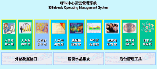 Teleweb-OMS運營管理系統(tǒng)共有11個模塊,涵蓋了動態(tài)質(zhì)檢管理、培訓管理、考勤管理、人力資源管理、話務預測與自動排班、KPI管理、績效考核、部門間的需求單管理等各個環(huán)節(jié),并且提供了外部數(shù)據(jù)抽取功能和報表自動生成功能。
