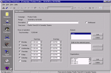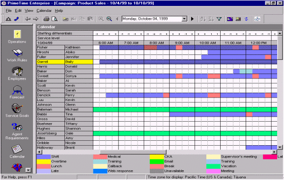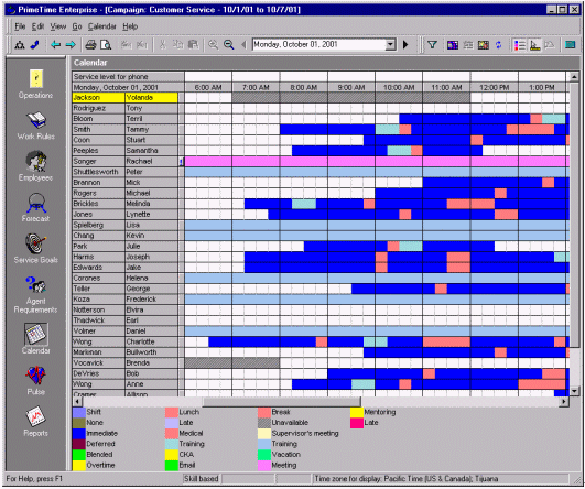絕大多數(shù)的WFMS可以通過(guò)歷史數(shù)據(jù)和人員情況自動(dòng)生成排班表。而且它也只是簡(jiǎn)單的根據(jù)呼叫中心的運(yùn)營(yíng)時(shí)間來(lái)排班。舉個(gè)例子,某個(gè)呼叫中心在排班是有兩個(gè)班,一個(gè)工作時(shí)間是早7點(diǎn)到下午3點(diǎn),另一個(gè)是早九點(diǎn)到晚五點(diǎn),這就意味著不僅要安排早、晚休息,還要顧及到午休的時(shí)間。休息的安排要保證能夠在電話的持續(xù)中也能有持續(xù)的人員保證電話量。在這個(gè)自動(dòng)化軟件的之中還有一個(gè)因素要能夠?qū)崿F(xiàn)自動(dòng)化--人的因素。例如:Mary和Jane想同時(shí)去吃午餐,然而自動(dòng)化的排班表并不是這樣的。然而主管根據(jù)當(dāng)時(shí)的話務(wù)量情況和工作狀況以及工作規(guī)范批準(zhǔn)了Mary和Jane共享午餐的要求,而WFMS就要能夠處理這樣很有可能發(fā)生,而且是合理的情況。排班表的更改應(yīng)該就是簡(jiǎn)單的拖拽圖標(biāo)就應(yīng)該能夠?qū)崿F(xiàn)的功能,并且能夠在這種更改會(huì)對(duì)預(yù)測(cè)的話務(wù)量差生不好影響時(shí),拒絕這種拖拽行為。
