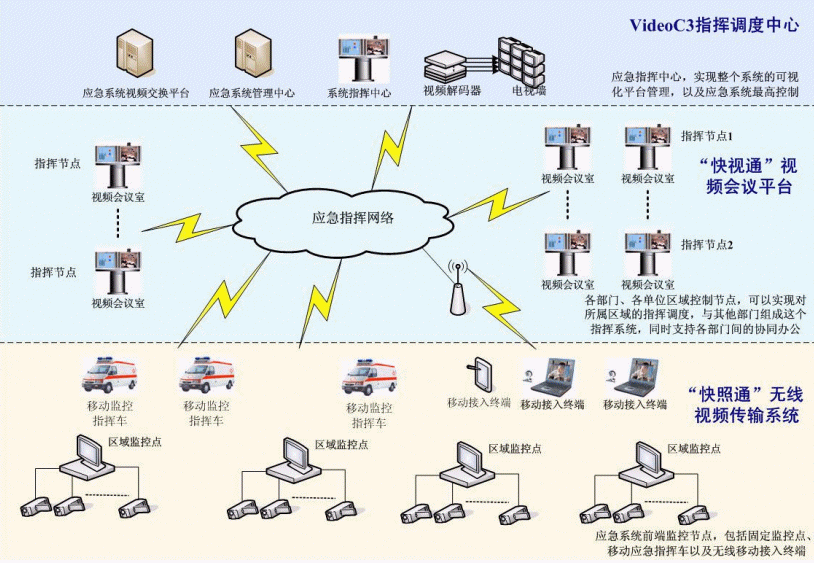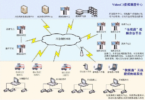C3I視頻應(yīng)急指揮協(xié)同系統(tǒng)在政府IP網(wǎng)絡(luò)中處于城市的神經(jīng)中樞。它將政府各個部門、單位聯(lián)系成為一個整體。在C3I視頻應(yīng)急指揮協(xié)同系統(tǒng)的前端,由"快照通"無線視頻傳輸系統(tǒng)對政府所屬各個單位進(jìn)行實時監(jiān)控,時刻掌握現(xiàn)場動態(tài),該部分支持固定點監(jiān)控,也支持移動指揮點和無線移動接入終端,保證了前方工作的靈活、機動性;在系統(tǒng)的指揮中心部分,由VideoC3指揮調(diào)度中心來支持,它一方面需要對前端的監(jiān)控信息進(jìn)行控制,同時,要對整個政府進(jìn)行綜合管理調(diào)度,在發(fā)生突發(fā)狀態(tài)的時刻,現(xiàn)場前端"快照通"捕獲的相應(yīng)信息通過C3I系統(tǒng)平臺,迅速傳遞至指揮中心部分,政府管理人員通過VideoC3指揮調(diào)度中心對前端進(jìn)行遠(yuǎn)程指揮,在第一時間緊急處理現(xiàn)場突發(fā)事件;在整個C3I系統(tǒng)中,政府各個部門、單位之間通過"快視通"視頻會議平臺進(jìn)行辦公交流,支持各部門間的協(xié)同辦公,同時,也可以通過其實現(xiàn)對所屬區(qū)域的指揮調(diào)度。