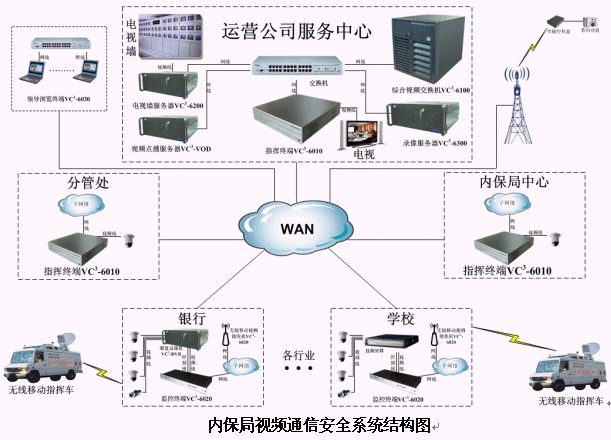 針對以上情況,北京華緯訊電信技術有限公司基于最新推出的VC3-6000綜合視頻通信平臺提出了針對性的"城市安保聯(lián)動視頻通信平臺"解決方案。該平臺整合多種資源,實現(xiàn)了視頻指揮調度、遠程視頻監(jiān)控、視頻會議、視頻點播、無線移動視頻接入、高清晰圖片傳輸和環(huán)境監(jiān)測等功能。平臺組成如下圖: