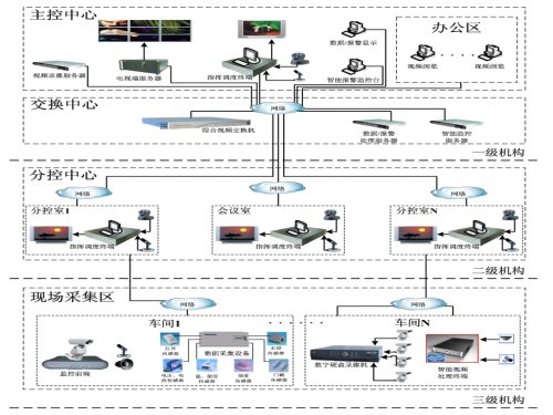 圖 4是一個典型的電力企業(yè)綜合視頻指揮調(diào)度系統(tǒng)網(wǎng)絡(luò)拓撲圖,在地理上可分一級機構(gòu)(主控中心操作顯示區(qū)、信息控制交換處理區(qū))、二級機構(gòu)(分控中心操作區(qū))、三級機構(gòu)(現(xiàn)場音視頻、數(shù)據(jù)、智能監(jiān)控點采集區(qū))。