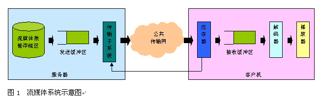 實(shí)時(shí)自適應(yīng)網(wǎng)絡(luò)帶寬的流媒體傳送技術(shù),是上海清鶴數(shù)碼科技公司的一項(xiàng)可大幅提高流媒體寬帶傳送過(guò)程中的關(guān)鍵服務(wù)質(zhì)量瓶頸的國(guó)際技術(shù)專利。我們知道,目前制約流媒體寬帶應(yīng)用發(fā)展的核心問(wèn)題在于服務(wù)質(zhì)量。簡(jiǎn)單地說(shuō),由于因特網(wǎng)的狀況是不可靠的,其帶寬、負(fù)荷等變化劇烈,這難以滿足流媒體寬帶業(yè)務(wù)的實(shí)時(shí)性服務(wù)質(zhì)量要求,并常常造成播放卡殼、延遲、視頻質(zhì)量抖動(dòng)劇烈等不良情況,給使用者感官造成很大影響。所以解決好流媒體寬帶應(yīng)用的服務(wù)質(zhì)量問(wèn)題對(duì)于流媒體寬帶應(yīng)用是極為重要的。如圖1所示,在一般的流媒體寬帶系統(tǒng)里,視頻服務(wù)器通過(guò)網(wǎng)絡(luò)向客戶機(jī)實(shí)時(shí)傳送流媒體信息。