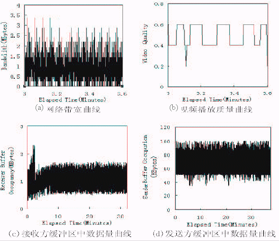 圖3給出了在劇烈的帶寬變化情況下,應(yīng)用該技術(shù)的視頻點(diǎn)播系統(tǒng)所達(dá)到的性能。在圖3中,(a)表示所使用的帶寬情況;(b)表示客戶端得到的視頻播放質(zhì)量;(c)和(d)分別表示在播放過(guò)程中接收緩沖區(qū)和發(fā)送緩沖區(qū)中的數(shù)據(jù)量情況。對(duì)比圖3(a)(b)可以看出,在網(wǎng)絡(luò)帶寬劇烈變化的情況下,視頻播放質(zhì)量的變化很平緩。由圖3(c)知,接收方緩沖區(qū)沒有發(fā)生上溢或下溢,這表明客戶始終能享受到連續(xù)的視頻播放,沒有出現(xiàn)播放卡殼;也沒有出現(xiàn)因?yàn)榫彌_區(qū)上溢而丟失從網(wǎng)絡(luò)傳過(guò)來(lái)的數(shù)據(jù)。圖3(d)則表明發(fā)送緩沖區(qū)始終在80k字節(jié)左右,沒有發(fā)生下溢,說(shuō)明數(shù)據(jù)發(fā)送模塊始終有數(shù)據(jù)可發(fā),即網(wǎng)絡(luò)帶寬得到了充分利用。