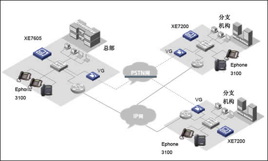 當企業(yè)存在多個大型分部的時候,如一個國際性公司。則可以在各個分部部署XE7000冗余方案,每個分部維護獨立的本地用戶信息。各小分支機構(gòu)的IP語音終端可以直接注冊到本地XE7000上,從而實現(xiàn)整網(wǎng)的分布式部署。