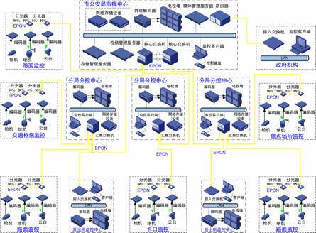 一般說來,城市監(jiān)控系統(tǒng)的網(wǎng)絡承載平臺要求建設專網(wǎng)或者VPN網(wǎng)絡。對于光纖資源較為豐富的城區(qū),可以使用數(shù)字SFP光纖接入,一個前端攝像頭對應一條光纖;在光纖資源較少的區(qū)域,可以使用EPON(無源光網(wǎng)絡)技術,一芯光纖上可以同時接入多個前端攝像頭,大量節(jié)約了光纖資源和光纖租用成本;對于較為復雜的環(huán)境,不適合進行布線,可以采用無線接入的方式,降低施工成本。