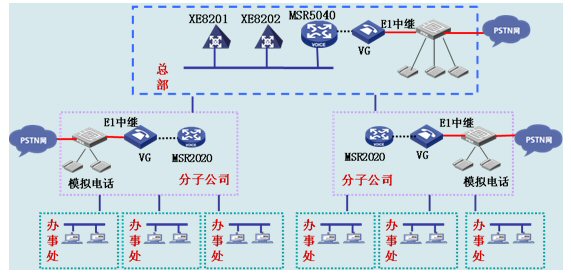 集團總部和分子公司部署H3C公司的VG80-20作為語音網關,VG 80-20提供2個E1語音接口用于接連接程控電話交換機PBX的E1中繼線,通過以太網口連接到IP網中。