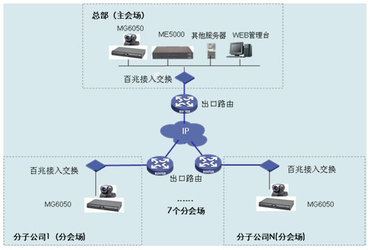 集團總部主會場和各個分會場各部署一臺H3C公司的MG6050多媒體網關,同時支持H.323和SIP協(xié)議,支持H.263/H.264編碼技術和4CIF高清晰圖像分辨率,最高可以提供2M會議帶寬。集團總部主會場和各個分會場推薦使用Sony