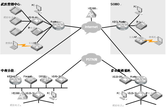要求實現(xiàn)IP語音網(wǎng)絡向廣域網(wǎng)的擴展,實現(xiàn)IP語音無處不在,內(nèi)部電話完全免費。并保證廣域網(wǎng)的安全訪問。