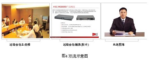 雙視頻流傳輸是指同時(shí)傳輸兩路動態(tài)視頻到各分會場:雙流是指分會場能夠?qū)⒈緯䦂龅膬陕芬曨l同時(shí)傳輸?shù)組CU上,MCU 能夠?qū)陕芬曨l同時(shí)傳輸?shù)礁鞣謺䦂觥E5000與MG6060配合可以將終端第二路視頻傳輸?shù)狡渌麜䦂,適用于在開會的同時(shí),對文件、圖片講解,使會議更加生動,內(nèi)容更加豐富。