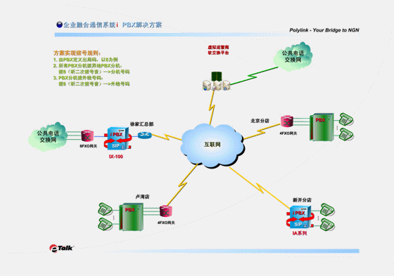此方案實施后,用戶今后的VoIP分點擴(kuò)容會十分簡單易行。當(dāng)用戶有新的分店時,分店的通訊系統(tǒng)可以直接上一臺Polylink eTalk® IA系列i PBX,它既有與PBX相同而且更多的各種功能,還具有VOIP網(wǎng)關(guān)的功能,可直接與總部的IX系統(tǒng)互相注冊,既省掉了多添置一臺語音網(wǎng)關(guān)的成本,也避免了設(shè)備的重復(fù)堆壘。