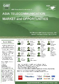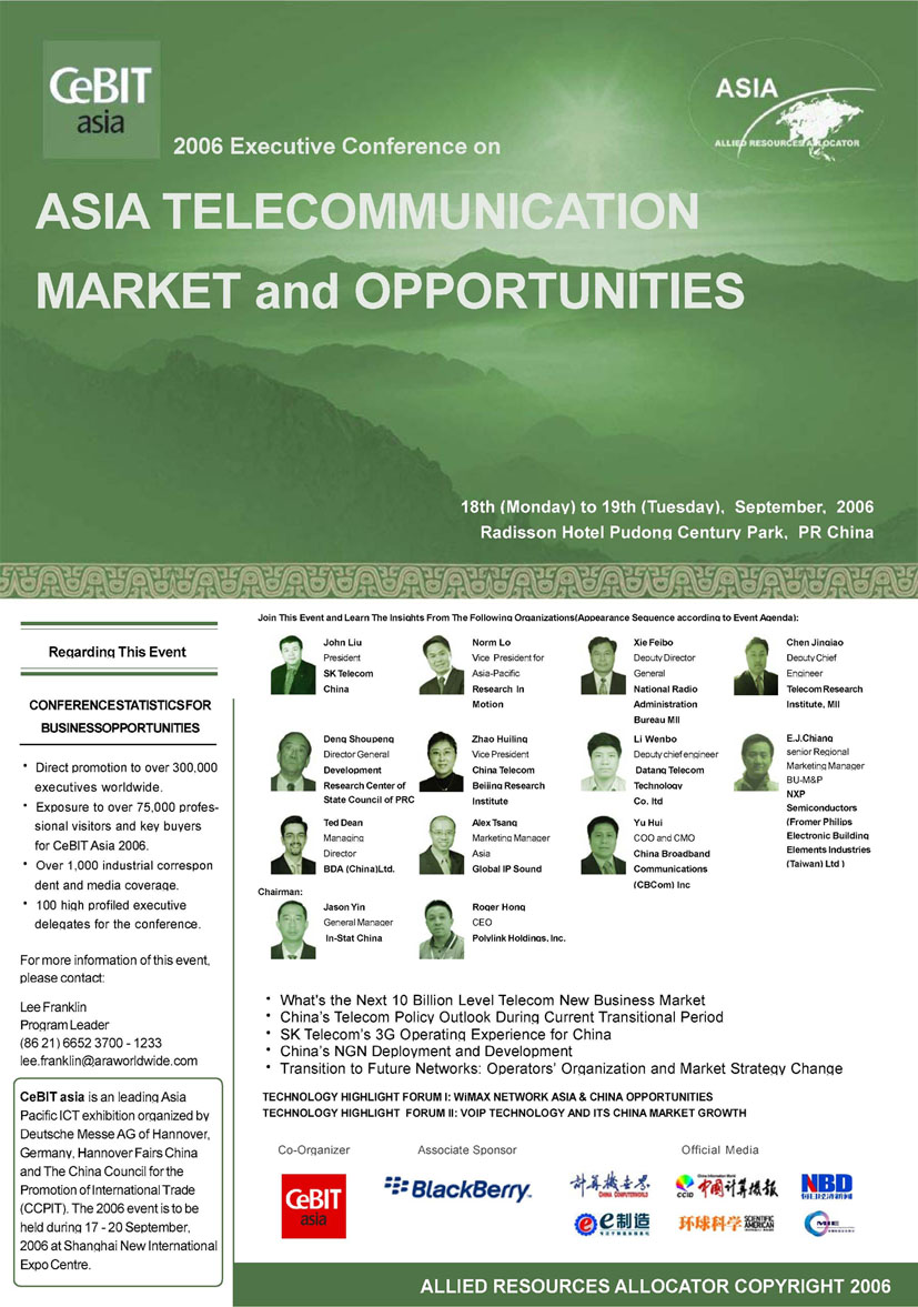 本次CeBIT展會(huì)期間(9月18、19日兩天),將在浦東證大麗笙酒店召開“2006亞洲通信及信息市場(chǎng)管理層論壇”。包括中國(guó)國(guó)家信息產(chǎn)業(yè)部、中國(guó)電信、韓國(guó)SK電訊、BDA中國(guó)等多家政府機(jī)關(guān)、運(yùn)營(yíng)商、制造商將參加本次論壇,并做重要發(fā)言。