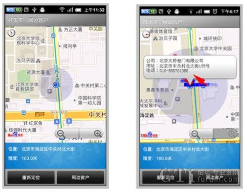 其二,打天下2.0新增了LBS的服務(wù)功能,原有的打天下只能實現(xiàn)拍照上傳、簽到等簡單功能應用,而新版本則可以提供check的位置服務(wù),通過check可以在地圖上顯示標記地點周邊分布的客戶地理位置信息,極大方便了外勤員工的路線制訂。
