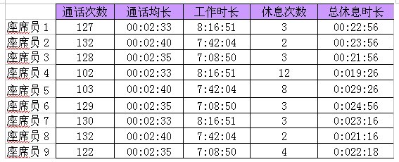 馬總直覺上認為是座席員4和座席員5,因為她們這兩位的通話次數(shù)最少,但座席員5其實并沒有搞鬼,她是擺明著在偷懶,也不怕人知道,因為她的總休息時長是最長的,絲毫沒有隱瞞的意思。