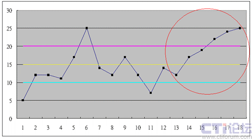 6、9、12法則是一個(gè)非常有威力的口訣,讓第一線的班長都可以從控制圖中,輕易的判斷是否有發(fā)生了特殊原因。