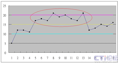 12就是數(shù)據(jù)有12個(gè)點(diǎn),像是鋸齒一樣,在均值上下連續(xù)跳動(dòng)(六西格瑪用到了14個(gè)點(diǎn),我認(rèn)為呼叫中心觀察到12個(gè)點(diǎn)就應(yīng)該可以確認(rèn)有特殊原因了)。
