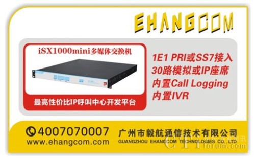 毅航通信為回饋社會(huì)各界朋友的關(guān)心與支持,加快中國(guó)中小企業(yè)呼叫中心產(chǎn)業(yè)化建設(shè),特推出作為最高性價(jià)比IP呼叫中心開發(fā)平臺(tái)的毅航iSX1000mini多媒體交換機(jī),1E1 PRI或SS7接入,30路模擬或IP座席,內(nèi)置IVR及Call Logging,價(jià)格優(yōu)惠。