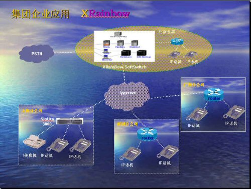 。。首先我們需要這4個地點都有自己的網(wǎng)絡(luò)接入,最好是寬帶。以北京總部為列,如果將Xrainbow系統(tǒng)放在北京總部,這就需要北京總部這邊有一個固定IP地址的網(wǎng)絡(luò)接入,其他分公司不需要固定ip地址,只要可以上網(wǎng)就可以登錄到北京總部的Xrainbow系統(tǒng)。這樣企業(yè)與分支機構(gòu)之間就實現(xiàn)了零話費,同時還可以提供傳真業(yè)務。另外終端設(shè)備可以隨意移動,只要可以上網(wǎng)的地方就可以接入我們的終端設(shè)備,免去了因公司的發(fā)展或者搬動而要去申請初裝大量電話的煩惱。