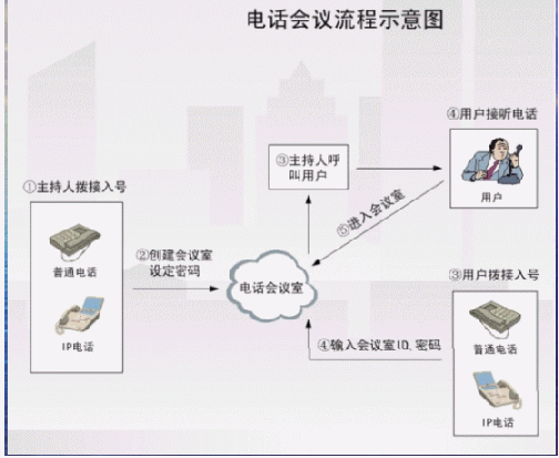 - 多方電話會(huì)議功能,最多可以實(shí)現(xiàn)16方通話。電話會(huì)議介紹(當(dāng)會(huì)議室中僅有一個(gè)人的時(shí)候,聽到的是等待音樂)。