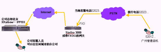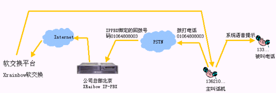 - 跨地域來電轉(zhuǎn)接,比如某個(gè)分支機(jī)構(gòu)的客戶撥叫該分支機(jī)構(gòu)電話,電話接起后,如果客戶需求沒有得到順利的答復(fù),在客戶電話保持的情況下,可以將電話轉(zhuǎn)接到在全國(guó)的任何一個(gè)IPPBX分機(jī)上。