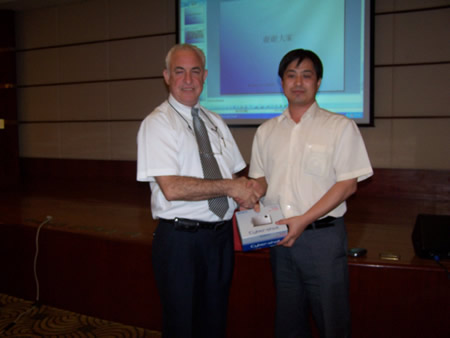 圖為北京站研討會一角及一等獎(jiǎng)(T33數(shù)碼相機(jī))中獎(jiǎng)?wù)吲cDana先生合影。