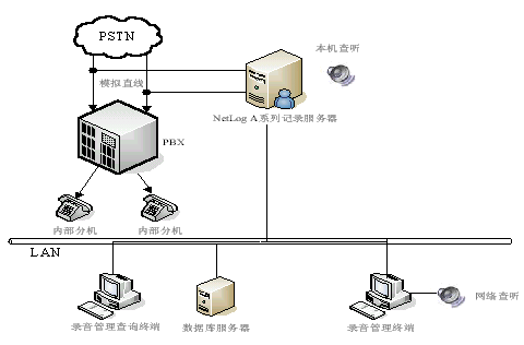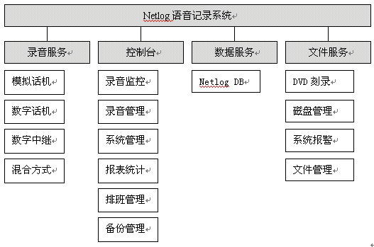 NetLog語音記錄系統(tǒng)采用基于分布式、多層控制管理體系的設(shè)計思想,將電話線路與內(nèi)部網(wǎng)絡(luò)有效地結(jié)合在一起,形成一套完整的語音記錄、管理系統(tǒng)。NetLog系統(tǒng)包括數(shù)據(jù)服務(wù)、文件服務(wù)、記錄服務(wù)、控制臺;