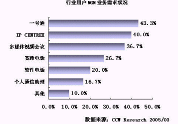 NGN 成為電信運(yùn)營(yíng)商滿(mǎn)足用戶(hù)需求的有力武器。不同的行業(yè)用戶(hù)對(duì)基于 NGN 推出的電信業(yè)務(wù)表現(xiàn)出了較大的需求差異,例如: IT通信、物流和服務(wù)業(yè)對(duì) IP CENTREX 、多媒體視頻會(huì)議和寬帶電話等業(yè)務(wù)比較感興趣,而政府用戶(hù)對(duì)一號(hào)通等業(yè)務(wù)比較感興趣。不同行業(yè)對(duì)業(yè)務(wù)需求具有差異性,這就要求運(yùn)營(yíng)商基于 NGN 平臺(tái)開(kāi)發(fā)的業(yè)務(wù)要有更大的靈活性,要有突出用戶(hù)通信需求的整體解決方案,要能滿(mǎn)足用戶(hù)的個(gè)性化需求。