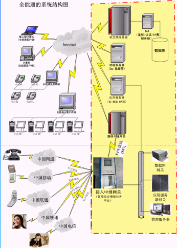 全能通顧名思義:各種網(wǎng)絡(luò)都能通(固定網(wǎng)、移動(dòng)網(wǎng)、互聯(lián)網(wǎng)三網(wǎng)合一)。全能通核心目的是實(shí)現(xiàn)互聯(lián)網(wǎng)(Internet)用戶(hù)與固定網(wǎng)(PSTN)電話/小靈通用戶(hù)、移動(dòng)網(wǎng)(PLMN)手機(jī)用戶(hù)之間無(wú)障礙通信,它不僅可以提供語(yǔ)音、數(shù)據(jù)、文本、視頻等多種媒體的信息服務(wù),還提供了各種增值業(yè)務(wù)和網(wǎng)絡(luò)辦公等功能。