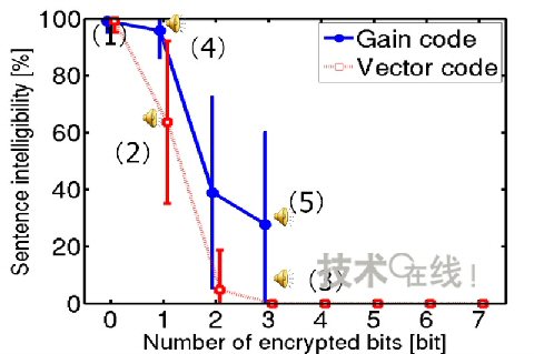 東北大在7bit波形編碼和3bit振幅編碼中采用不同的分割bit數(shù),將其與未分割bit合成后,請6位參試人員聽辨解碼后的音頻數(shù)據(jù),評估了維持保密性所需的最小bit數(shù)(圖2)。
