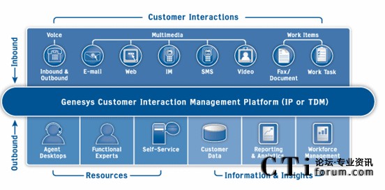 Genesys Customer Interatcion Management Platform是一個(gè)開放、可擴(kuò)充、有彈性的客戶管理交互平臺(tái)。它是建構(gòu)客服中心的核心 ,所有Genesys解決方案模塊 ,包含企業(yè)智能路由(Enterprise Routing Solution)、智能網(wǎng)端智能路由(Network Routing Solution)、外撥解決方案(Outbound Contact Solution)、互聯(lián)網(wǎng)解決方案(Internet Contact Solution)、勞動(dòng)力管理方案(Workforce Management Solution)等等都是建構(gòu)在Genesys的基礎(chǔ)平臺(tái)之上。使得Genesys所有的模塊都可充份整合在一起 ,提供客戶全方位、全功能的企業(yè)交互解決方案。