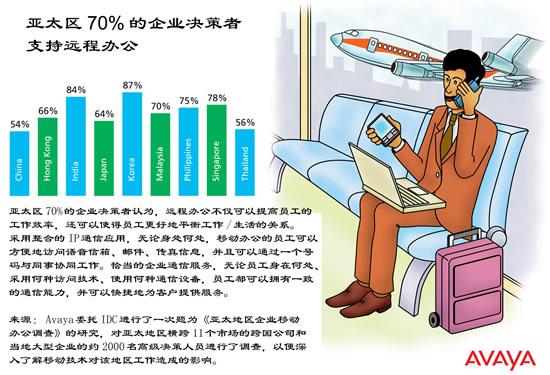 全球領(lǐng)先的企業(yè)通信軟件、系統(tǒng)和服務(wù)供應(yīng)商Avaya公司(紐約證券交易所上市代碼:AV)近日公布了針對(duì)整個(gè)亞太地區(qū)關(guān)于遠(yuǎn)程辦公的調(diào)查報(bào)告,結(jié)果表明,亞太地區(qū)70%的企業(yè)高層管理者支持員工遠(yuǎn)程辦公,認(rèn)為可以有效地提高員工的工作效率,進(jìn)而提高企業(yè)的競(jìng)爭(zhēng)優(yōu)勢(shì)。