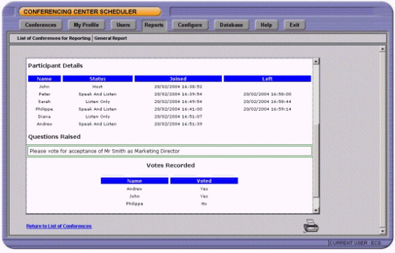 管理員可以生成會議使用率和每個會議的報告。消息內(nèi)容包括會議名稱,ID號,會議起始日期,會議持續(xù)時間和與會人員的數(shù)目。每個會議報告可以列出與會人員的詳細(xì)列表和他們何時進入/離開會議。