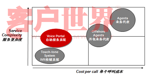 讓我們來看看這張圖。這張圖縱軸是服務(wù)的復(fù)雜度,橫軸是單位呼叫成本,傳統(tǒng)的IVR(觸鍵的語音IVR)和人工服務(wù)相比,服務(wù)的復(fù)雜度可就差多了。而Voice Portal的概念是用比較少的成本做更多的業(yè)務(wù),從成本上講比原來的傳統(tǒng)的IVR可能成本稍微高一點點,但是和人工服務(wù)相比,無論是和單位自建呼叫中心座席比,還是和外包呼叫中心座席比,成本都有很大降低,但業(yè)務(wù)復(fù)雜度可以做得比傳統(tǒng)IVR復(fù)雜很多。我們承認,就提供服務(wù)的內(nèi)容來講,Voice Portal今天仍然不能夠像人工那樣提供那么全面的服務(wù),但是可以涵蓋很多服務(wù)內(nèi)容,在這方面一是因為技術(shù)先進了,另一方面也在于引導(dǎo)。今天我看到越來越多的客戶已經(jīng)開始有意識的推行自助服務(wù)形式。我前幾年去新加坡打出租,發(fā)現(xiàn)在新加坡有很多叫出租的車站,車站上有一個按鍵,按鍵上有一個編碼,說明你在什么位置,當(dāng)你打通出租車客服的電話,你只要告訴這個編碼,他們就自然而然知道你在什么地方,并把要來接你的車車牌號通過語音報讀方式通知你。今天在中國也開始有這種形式了。昨天我沒有開車,也算是支持北京市每周少開一天車的號召,我打了出租,在和出租司機聊天的過程中,出租司機說現(xiàn)在油價很貴,他們有很強烈的需求不愿意掃馬路,他們也有一個出租車叫車電話,那個呼叫中心大概有上百個坐席,這個公司有一萬六千輛出租車在北京,由他們來進行搶答,搶答完之后你可以告訴說這個人在什么地方等,唯一不同的我們在自助化上還沒有做得那么到位,司機搶到了活還要給客戶打一個電話,不象新加坡完全是自助的,你只要按了那個鍵,系統(tǒng)就知道你在什么地方,當(dāng)尋找到合適的車的時候,語音報讀你車牌號就行了。我和說出租車師傅,那你打電話成本不是增加了嗎,他一笑,增加打一個電話的成本怎么也比掃馬路強。大家可以看看呼叫中心多有用,自助服務(wù)能省多少錢。
