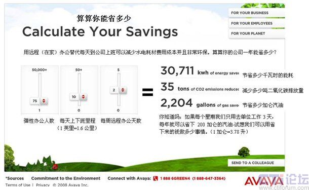 北京,2009年1月20日 –企業(yè)通信系統(tǒng)全球領(lǐng)導(dǎo)者Avaya公司日前發(fā)布了“在線節(jié)能計算器”,以幫助企業(yè)估算通過彈性辦公可以節(jié)省多少能源。用戶登陸網(wǎng)址之后,提供相關(guān)參數(shù),便可以得到能源節(jié)約的數(shù)據(jù)。