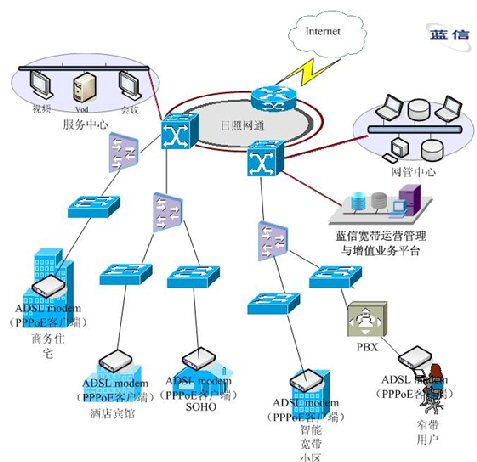 在以以太網(wǎng)技術(shù)為主建設(shè)的運營區(qū)域,在中心由一臺模塊化的核心交換機支持,輔以多臺BASE設(shè)備連接,在接入層用交換機做接入設(shè)備,保證用戶數(shù)據(jù)的快速傳播。在網(wǎng)絡(luò)核心處,部署信利公司的藍信寬帶認(rèn)證計費系統(tǒng),負(fù)責(zé)對全網(wǎng)用戶的安全認(rèn)證、計費及管理。藍信寬帶認(rèn)證計費系統(tǒng)除支持標(biāo)準(zhǔn)的RADIUS協(xié)議外,還支持PPPoE、802.1x認(rèn)證。在用戶終端處,部署藍信特制的PPPoE客戶端,實現(xiàn)撥號上網(wǎng)。