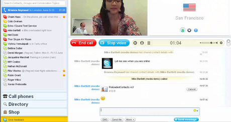 顯著的一個(gè)大改變是,軟件界面變成了全屏,而視頻窗口又占據(jù)了絕大部分版面。在視頻中還有“畫中畫”的功能,小的畫面可以任意移動(dòng)?梢哉fskype從一部網(wǎng)絡(luò)電話,變成了一部網(wǎng)絡(luò)可視電話。或者,好像感覺是在視頻聊天室中一樣。