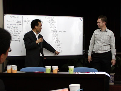 公開課在Simon Kriss先生詼諧的講課風(fēng)格的引導(dǎo)下自始至終在輕松、愉快又不失專業(yè)深度的氛圍中進(jìn)行著,而Simon Kriss先生以呼叫中心運(yùn)營(yíng)管理的高效率為主題,從呼叫中心的環(huán)境布局、預(yù)測(cè)管理、人力資源管理、效率管理到專業(yè)報(bào)告形式等知識(shí)點(diǎn)上做了專業(yè)深入的講解。尤其在人力資源管理和效率管理方法的傳授時(shí)引發(fā)了全體學(xué)員極大的興趣和反應(yīng),例如:就人員附著度的定義及操作問(wèn)題學(xué)員同講師展開了多倫次的討論。而Simon