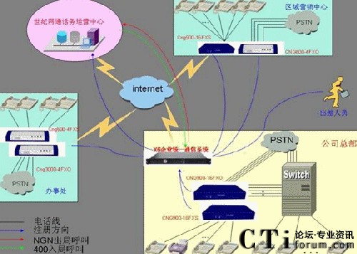 總部現(xiàn)在使用的為傳統(tǒng)PBX設備,配置為50路外線和200內(nèi)線,分機為8前綴4位的分機號碼,如8001分機。32個的辦事處使用電信匯線通或直接的PSTN線路,2個的區(qū)域營銷中心使用匯線通或直接的PSTN線路,2個分公司使用的小型PBX?偛磕壳吧暾埩4條2M的ADSL線路做為一個集合,沒有固定的IP地址,各個分公司也多使用ADSL上網(wǎng)或電信的小區(qū)寬帶上網(wǎng)。