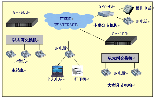 - 分公司:選用一臺4口網(wǎng)關(guān)設(shè)備,接入到互聯(lián)網(wǎng)絡(luò),通過公共的IP交換中心建立起呼叫連接,實現(xiàn)打電話的功能。模擬了通過網(wǎng)關(guān)設(shè)備接入PBX(電話程控交換機(jī)),如果其它分部也要接入PBX,與此情況類似。(詳見后面的"撥號示例")